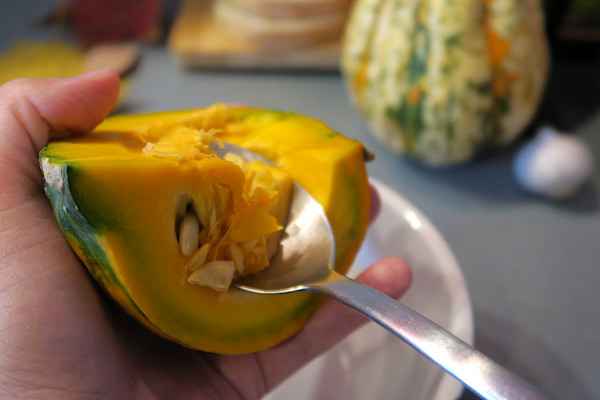 Um den Kürbis ganz einfach zu schneiden, kannst Du ihn in einen vorgeheizten Ofen bei 150 ° für eine halbe Stunde hineinlegen. Nachdem er abgekühlt ist, lässt er sich ganz einfach und ohne Wiederstand schneiden.